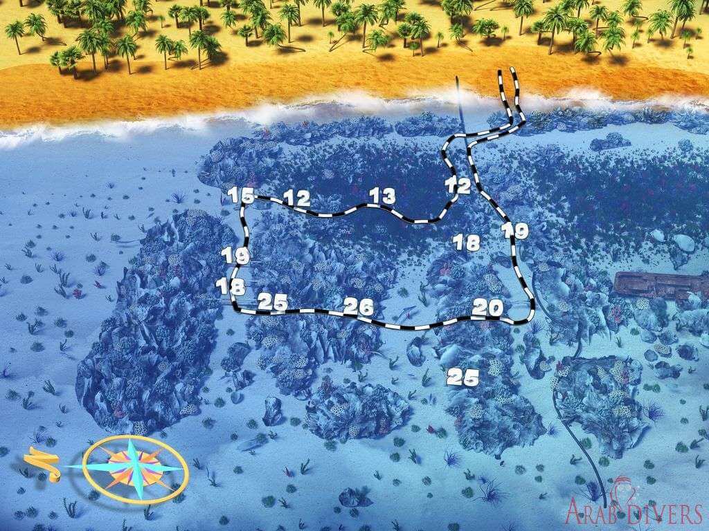 This one's easy to find, so we'll gear up on shore at the divers' platform, and head straight out for a very short swim to 6 m depth. We've already reached the end of the "rainbow"! Now it's a simple matter of following the reef contour down to about 18 m, where we'll turn north for an impressive wall diving experience.